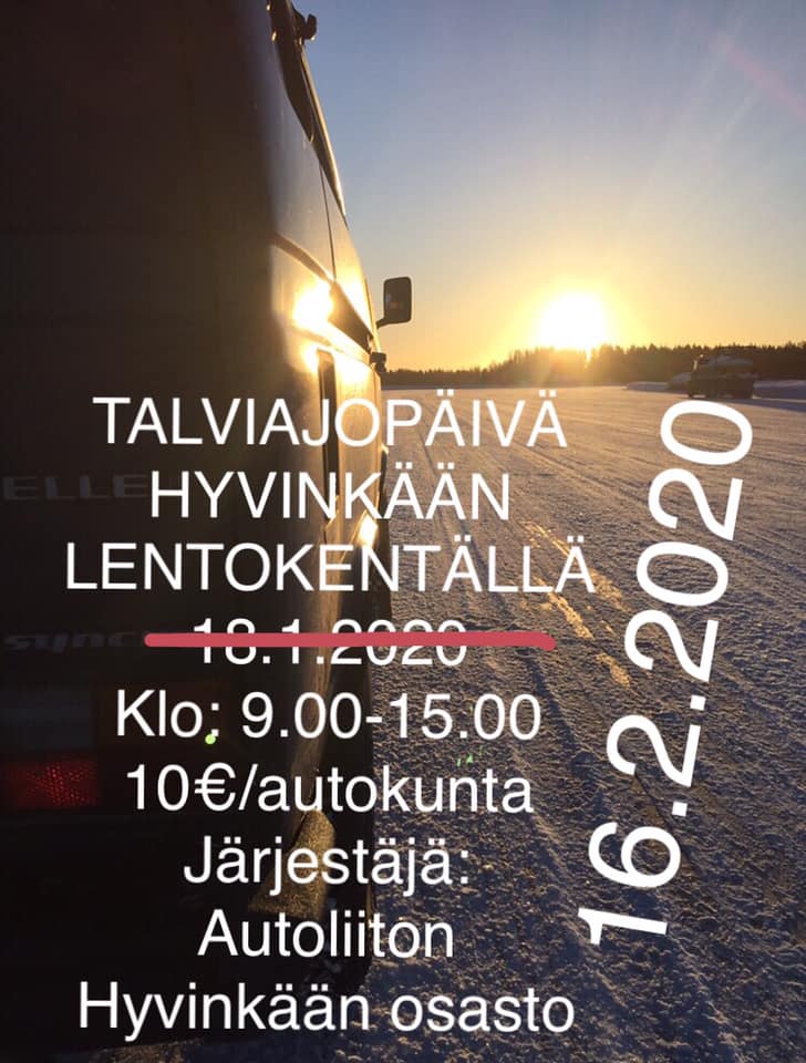 HUOM! LUMITILANTEESTA JOHTUEN PÄIVÄMÄÄRÄ ON MUUTTUNUT,. UUSI PÄIVÄMÄÄRÄ ON 16.2.2020………………………..18.1.2020 talviajopäivä Hyvinkäällä kello 9:00 – 15:00 välisenä aikana. Tapahtuma on jäsenille ilmainen, eikä siihen tarvitse ilmoittautua. Pääset testaamaan oman autosi (mahdollisuus kokeilla muitakin ajoneuvoja) ajo-ominaisuuksia turvalliseen ympäristöön, mm. miten ajonvakautus, luistonesto ja renkaasi toimivat. Lentokentällä sinulla on mahdollisuus ajaa pujottelu, jarrutus ja esteenväistö. Alueella myös n.1,6 km pitkä mutkarata sekä kitkaympyrä. Tarvittaessa saat liikenneopettajien talviajo vinkit.